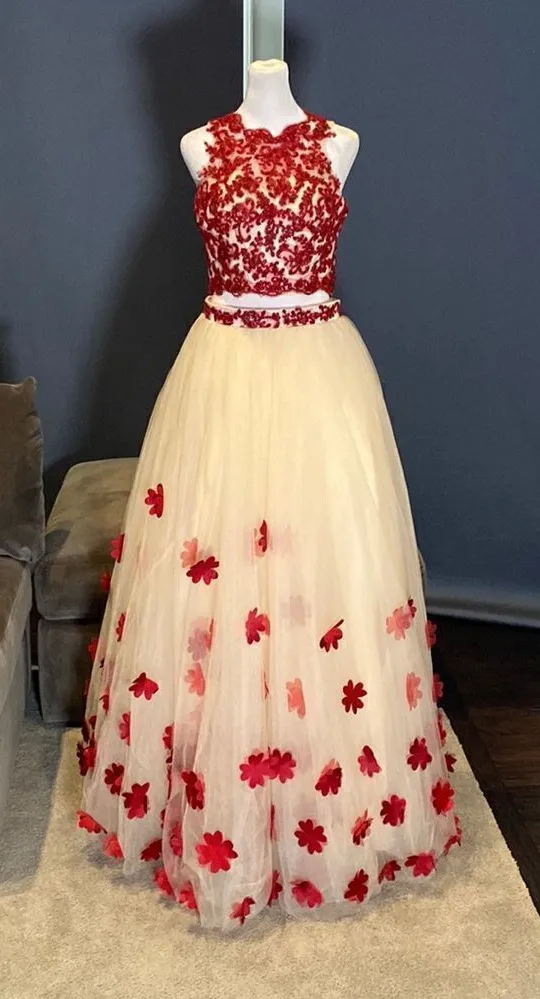 Women’s 2 Piece Dress with Halter Neck and Red Flower details on the Skirt. The Skirt is made up of multiple layers of material to give the skirt a really full look. The red flowers are glued on, not sewn on. The top has a pretty open back, and built in bra cups. This dress would be great for Prom, Homecoming, Sweet 16, Quinceanera, Party, Formal or Special Events. Size 6 approximately - please see pictures for approximate lay flat measurements. *Color may vary based on lighting and device used to view this item 0533B22