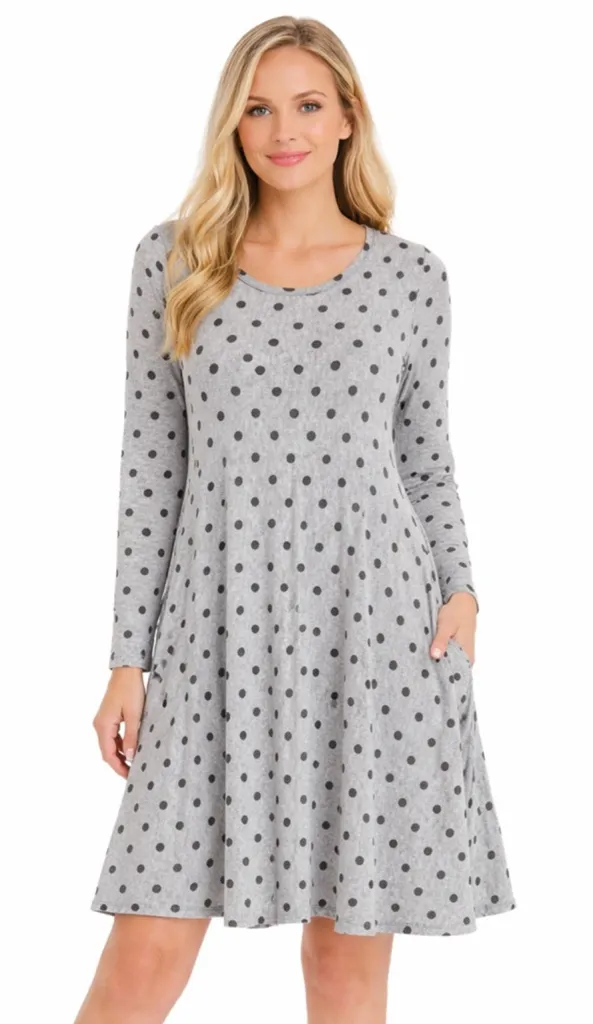 This is a pre-owned Angela Mara women's long-sleeve dress in a gray fabric with black polka dots. Th... Show more