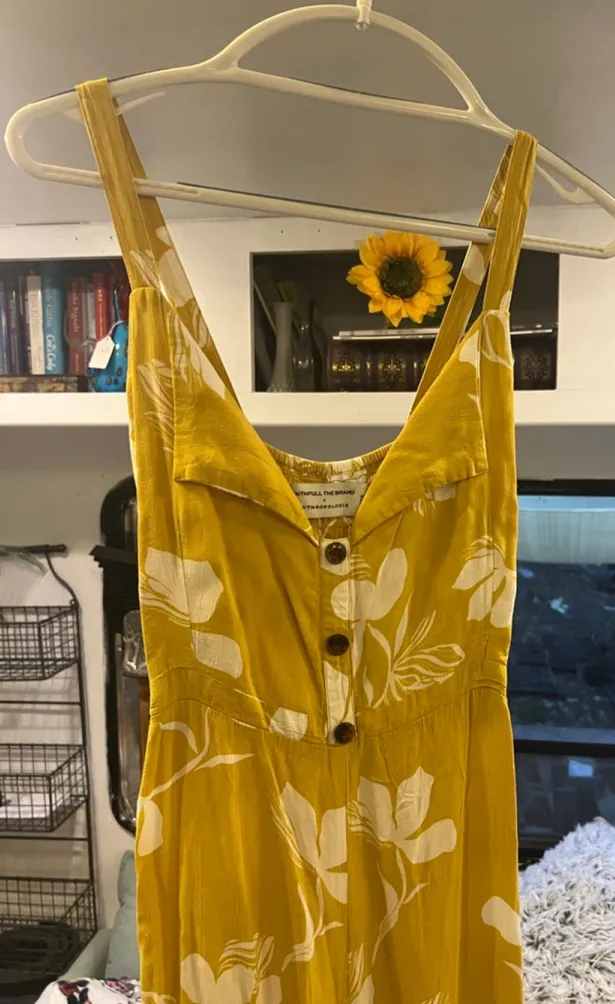 This is a pre-owned women's jumpsuit from Anthropologie, featuring a yellow base with a white floral... Show more