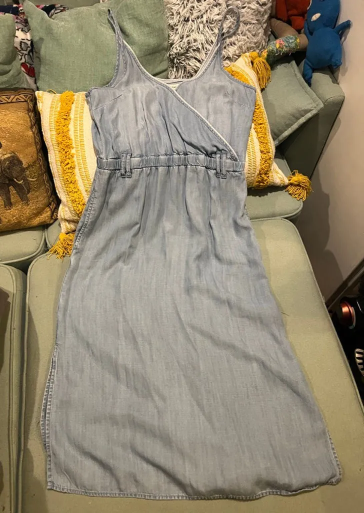 This is a pre-owned women's Cloth & Stone midi dress in light blue chambray, size XS. The dress feat... Show more