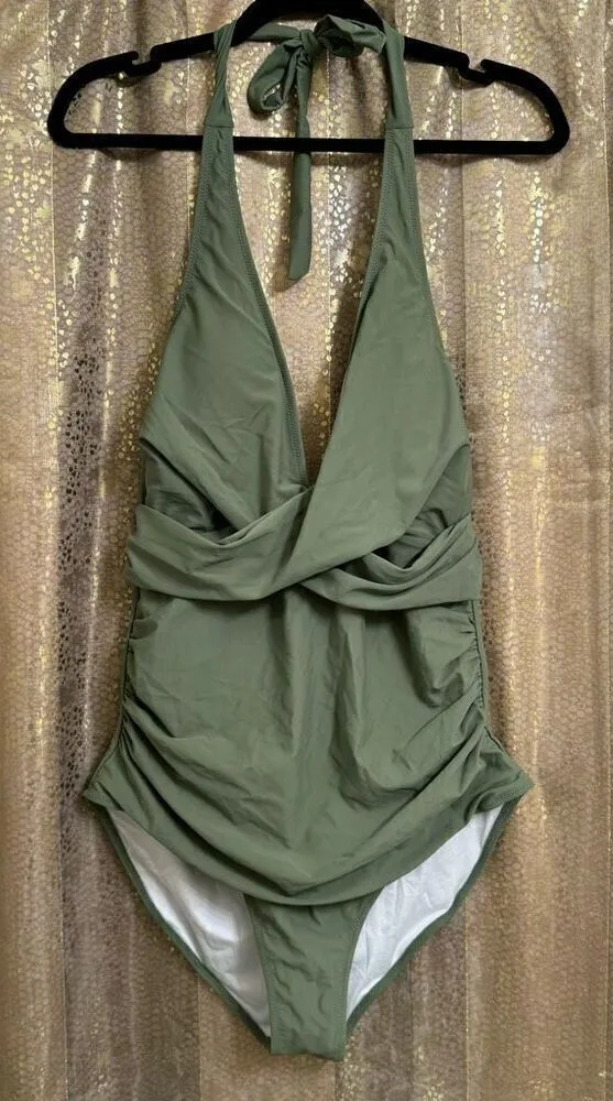 Women's Army Green Halter Deep V Neck One Piece Swimsuit XXL NWOT Brand new without tags, smoke an pet free home. No flaws at all. Size XXL, will fit sizes 14-16 best. Pretty Army/Olive Green color that is perfect for the beach, pool or resort on that much needed vacation! Features: Criss cross front, halter straps, removable padding and fully lined. I have tons of new and gently used swimwear in all different sizes and styles if you want to take a look and bundle! *Please note this is listed in the size it fits, not the size on the tag