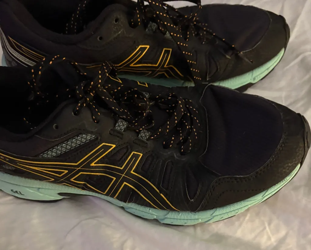 Dark gray or black AI gel venture seven running shoes with yellow accents and mint green soles. In l... Show more