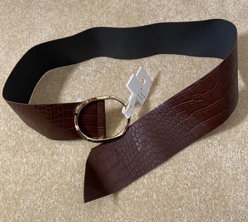 Women’s Barkwood Brown Wide Belt with Gold Buckle Size S - approximately 37” excluding buckle, 3” wide This belt does not have buckle holes, it is just threaded in buckle to hold. NWT