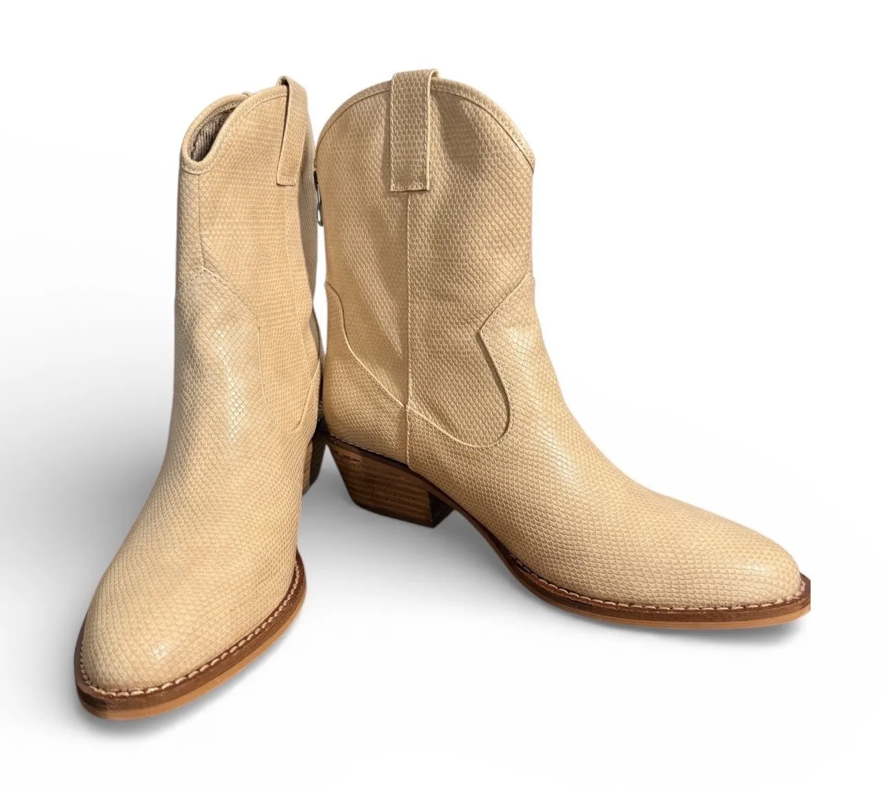 Step out in Western-inspired flair with these chic beige ankle boots. The intricate snakeskin embossing adds a touch of sophisticated texture, while the convenient full-length zippers on the back ensure effortless on and off. A sturdy block heel provides comfortable lift and a flattering silhouette, perfect for transitioning from a casual day out to an evening of fun. Elevate your look for brunch with friends, a country concert, or a stylish weekend getaway. Upper Material: Faux Leather Shoe Shaft Style: Ankle Theme: Cowgirl Lining Material: Fabric Insole Material: Synthetic Keywords: western boots, cowgirl boots, snakeskin print, embossed leather, block heel boots, ankle booties, neutral footwear, zipper boots, fashion boots, casual boots, ranch wear, street style, cowgirl core, nashville, cowgirl chic, cowboy chic