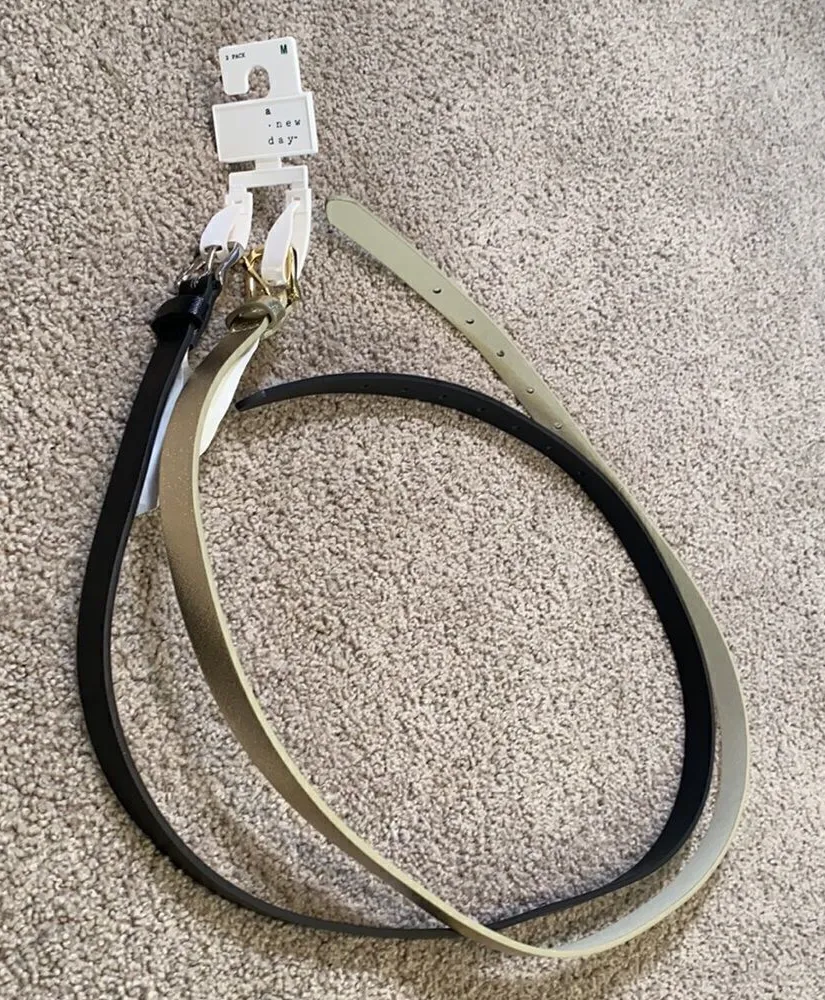 Women’s Belts 2 Pack One is Black with a Silver Buckle & the other belt is What I would describe as Gold (which shimmers and looks kind of silvery in certain light) with a Gold Buckle Size M - each belt is 39.5” long excluding buckle NWT 39.5