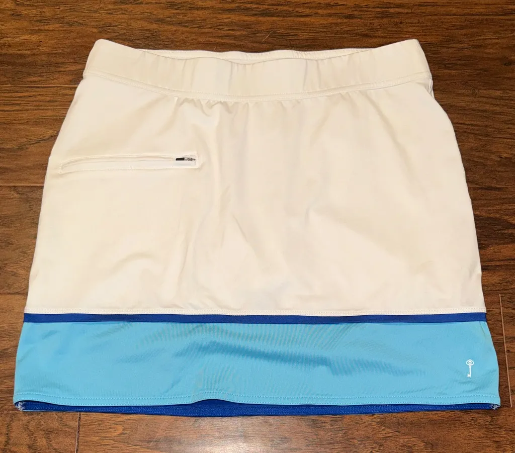 Size: small Brand: belyn key Color: white and blue Style: notting hill contrast skirt, spandex underneath, 3 pockets Measurements laying flat: - Waist 15.5 inches - Length 16.5 inches Made of: - Lining 92% polyester and 8% spandex - Shell 90% polyester and 10% spandex Condition: great