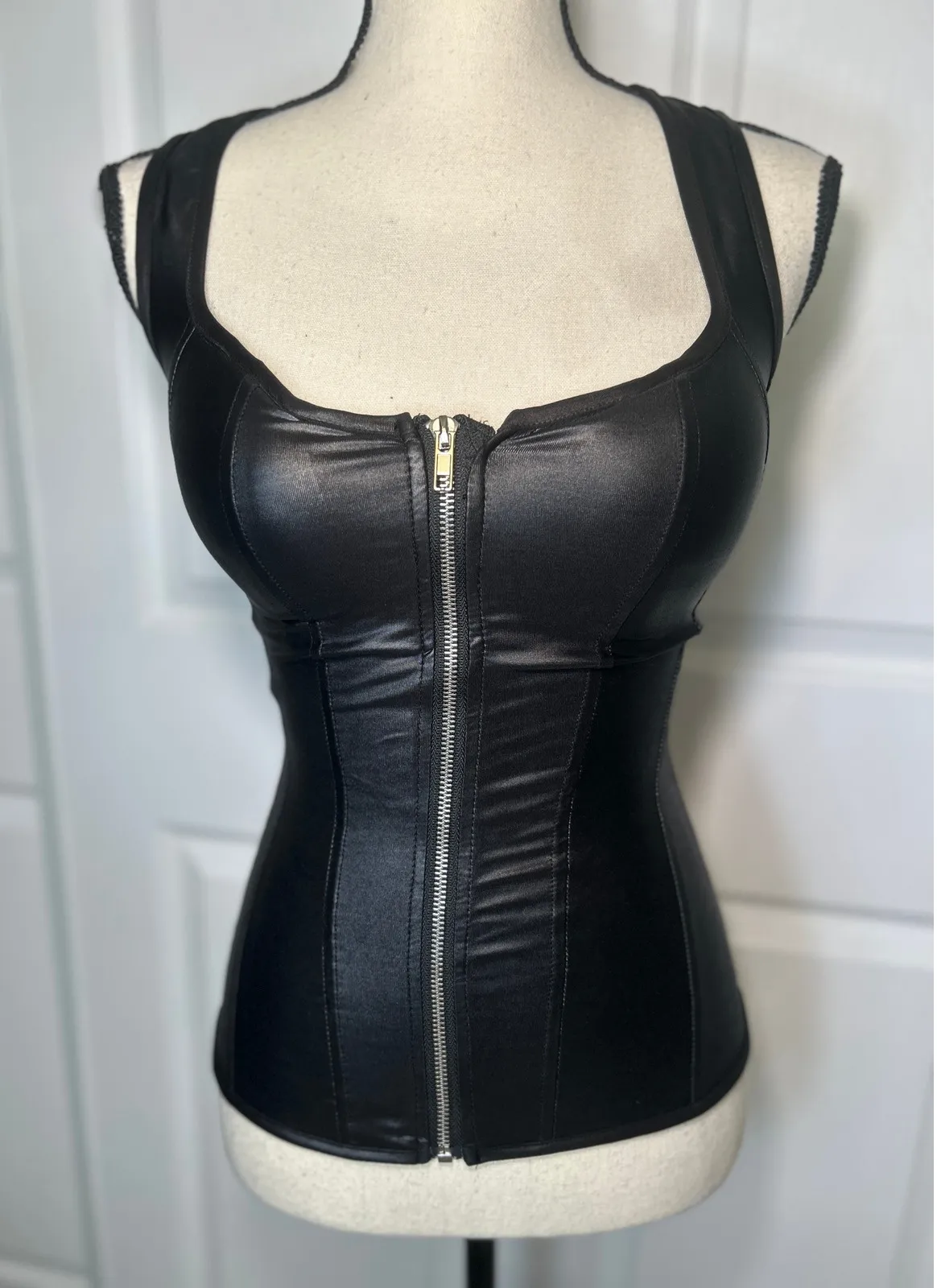 A striking black faux leather corset top designed for a sculpted silhouette. This piece features a convenient full-length zipper closure at the front and an adjustable lace-up detail at the back for a customized fit. The design includes supportive straps and a structured bodice that accentuates the waist. Built in bra padding. Worn twice. No flaws. Approx 17" across chest laying flat, 22" long Style: Corset Top Material: Faux Leather Theme: Steampunk, moto, goth Accents: Zipper, Strap Closure: Zip Keywords: faux leather, corset, goth, steampunk, edgy, night out, party wear, lace up, zipper front, sculpted fit, alternative fashion, costume, rave wear, bondage