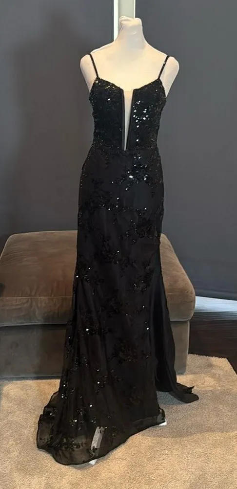 Women’s Black Mermaid Fit Dress with Sparkly Sequins and a Lace Up Back that really catches the eye as you move and sequins sparkle in the light. Spaghetti Straps Zip Up Skirt Small Train Large Left Side Leg Slit to show off your legs! Beautiful Dress for all Formal Occasions - Prom, Party, Birthday, Celebration,Homecoming, Quinceanera or Special Event! Also perfect for Cocktail Parties and Work Events Size 4 - please see pictures for approximate lay flat measurements. As this dress has a corset/lace up back there is room for size adjustment/fluctuation which is nice. The skirt section zips up below the straps. NWOT in original packaging, has been tried on *Color is subjective and may vary based on lighting and device used to view this item 1864B173