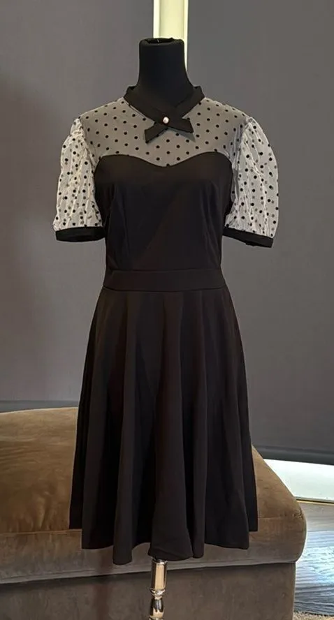 Women’s Black with Polka Dot Dress 1950’s Retro Style Spotted Material is sheer (see pictures) Zip Up Back Size M - see pictures for approximate lay flat measurements and size chart NEW in manufacturer packaging *Color is subjective and may vary based on lighting and device used to view this item 1447B180