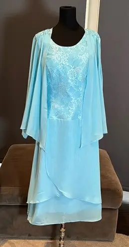 Women’s Blue Chiffon Dress with Floral Lace Detail and a Zip Up Back. The dress has a Round Neck and comes with a beautiful chiffon Matching Jacket with matching detail on the shoulders This dress has a really pretty hemline that is different lengths. Great dress for a Wedding Guest, Mother of the Bride, Mother of the Groom, Graduation, Bridesmaid, Formal or Special Event. Size 14 - please see pictures for approximate lay flat measurements. NWOT but has been tried on Approximately 48” long from shoulder to bottom hem *Color is subjective and may vary based on lighting and device used to view this item 1191B167