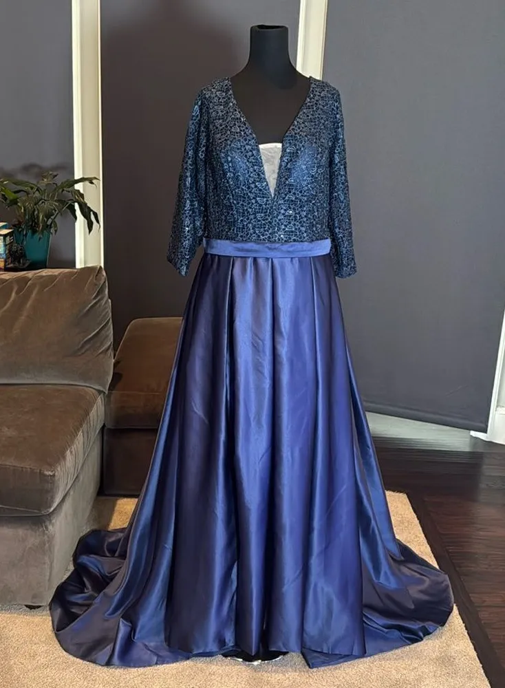 Women’s Blue Full Length 3/4 Sleeve Sparkly Sheer Bodice Dress with a Leg Slit and Corset Back The bodice sparkles as you move in the light, and is sheer (see my hand through the sleeve) The lower skirt is thicker satin with a train and hidden pockets. The sleeves are 3/4 sleeves Beautiful Dress for all Formal Occasions - Prom, Party, Homecoming, Quinceañera, Birthday, Celebration or Special Event! Size 14 - please see pictures for approximate lay flat measurements. As this dress has a corset back there is room for size adjustment/fluctuation which is nice. The back panel is quite wide (see picture) so room to go larger. I have it quite tightly laced in my pictures *Please note my camera washes out the color on close up pictures. Color is more accurate in further away pictures of the dress on the dress form *Color is subjective and may vary based on lighting and device used to view this item 1694B198