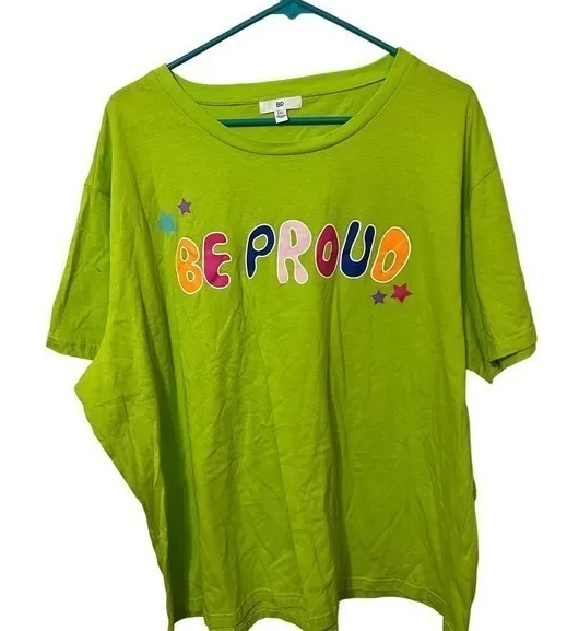 A vibrant statement piece for casual wear. This bright green t-shirt features the words "Be Proud" i... Show more