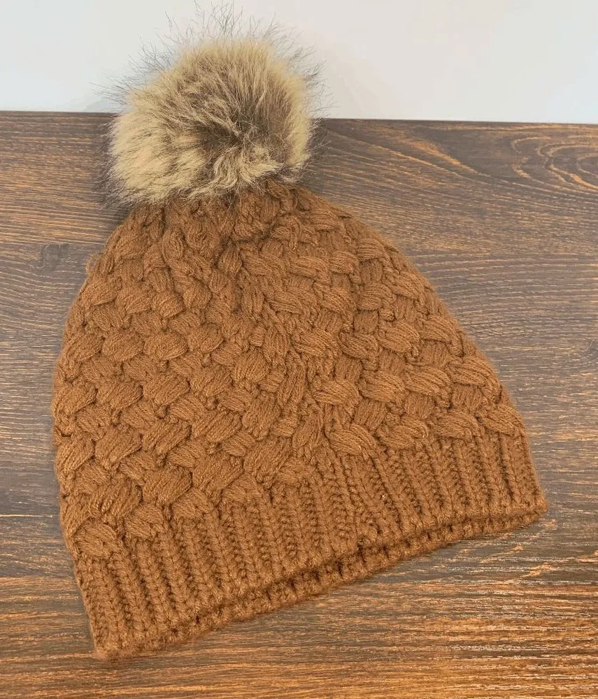 Women's Brown Cream One Size Cable Knit Soft Faux Fur Pom Pom Winter Beanie Hat Wrap up in style t... Show more