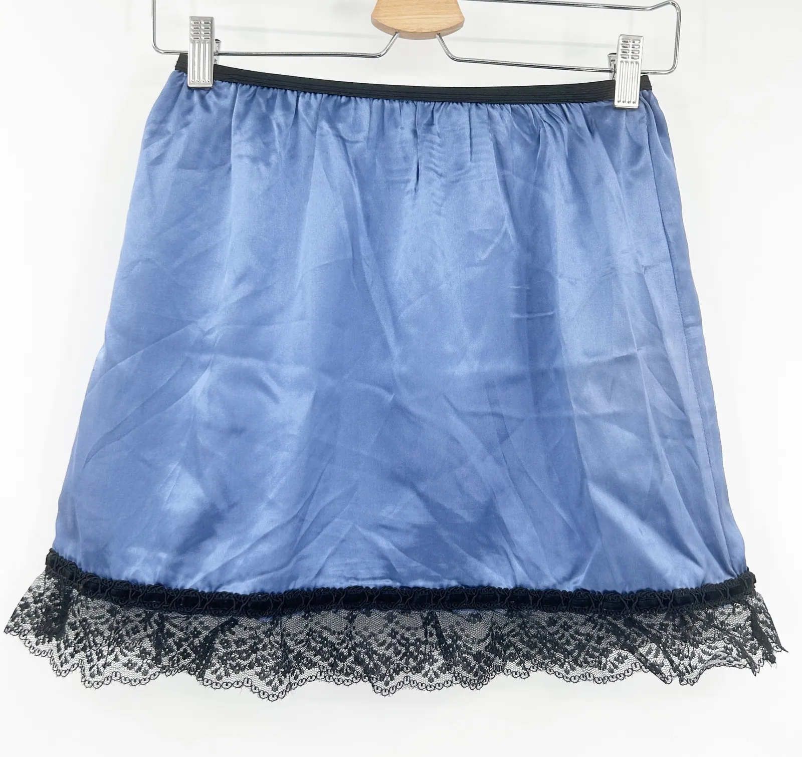 Womens Coquette Fairycore Romantic Satin Lace Trim Mini Slip Skirt Size S Blue and Black Good preow... Show more