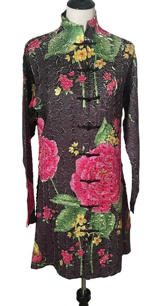 Womens Long Top or Short Dress Asian Floral Bird Print Black Knot Buttons Crinkle Fabric High Collar Size M Pre Owned, in Great Shape Great Quality No Holes, Stains or Fading Pet Free Smoke Free