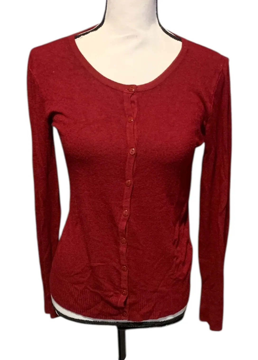 Women's Dark Red Button-Up Cardigan Sweater Preppy Business Casual Size large Cotton polyester Excellent condition Unknown brand Armpit to armpit measures 17 inches Shoulder to hem measures 23.5 inches
