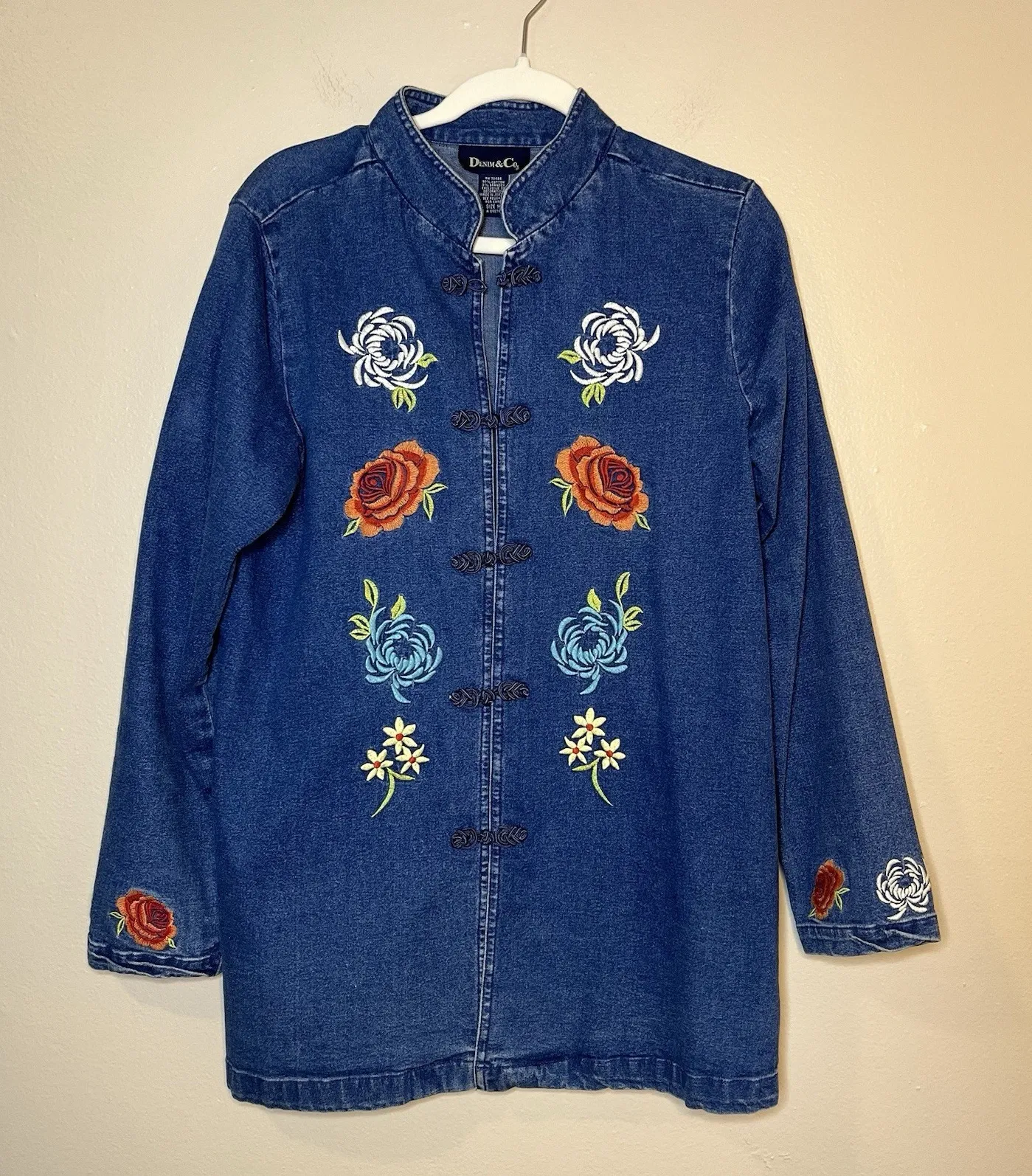 A beautiful vintage denim jacket -embroidered -denim with a tiny bit of stretch -frog closures -mid length In good used condition, has some slight wear on embroidery, no major flaws found Women's size M Measurements are approximate & taken while item was laid flat: Chest: 20.5" Waist:20.5" Hips:21" Length: 31" Length of sleeve form shoulder seam to cuff: 24.5" Please let me know if you have any questions!