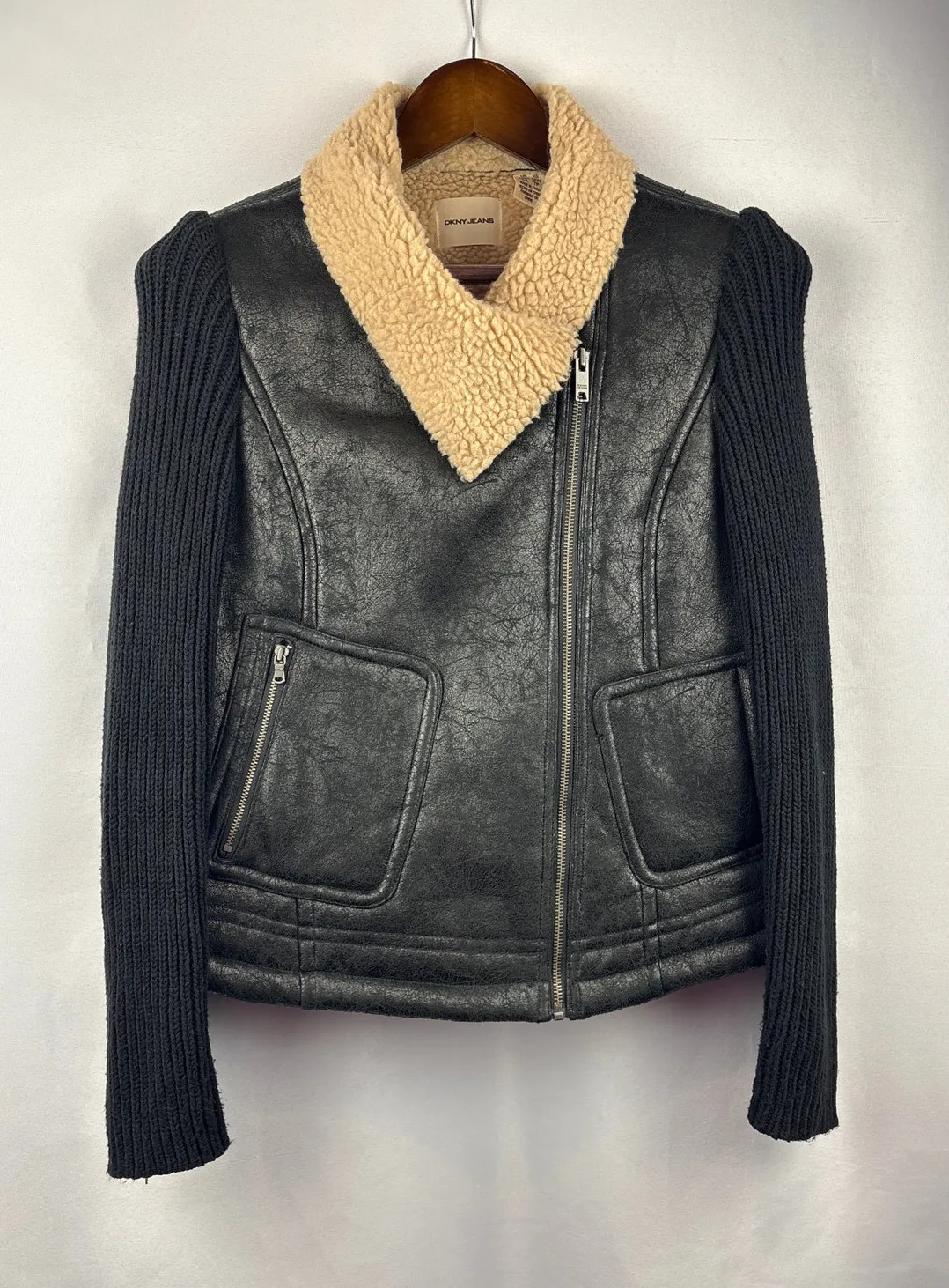 This women’s DKNY Jeans black suede jacket has knit sleeves and is fur lined. It will keep you warm... Show more