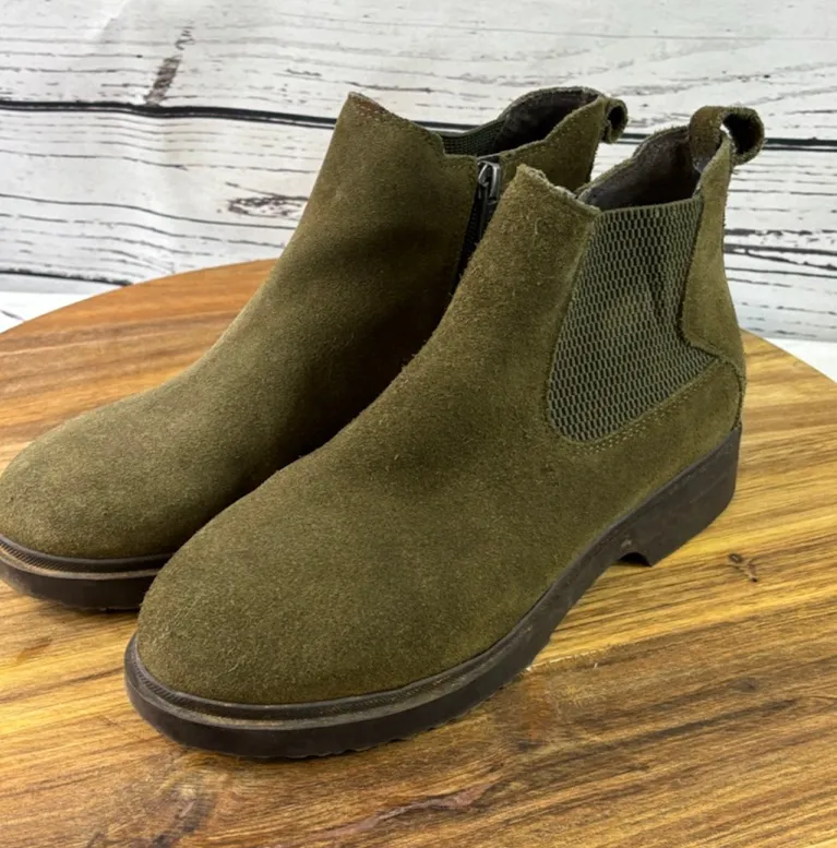 These are a pair of women's Easy Spirit Martha Stewart olive green suede ankle boots, size 7.5. The... Show more