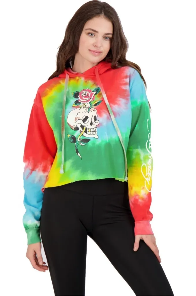 Bold tie-dye drawstring hoodie with edgy skull and rose graphic. Vibrant colors in a boxy cropped length and rolled hem Ed Hardy script down left arm Size: medium Color: red, green, blue, yellow tie dye Material: 70% cotton, 30% polyester Measurements: approximately 22” pit to pit, 19” length In excellent pre-owned condition with no visible flaws. Smoke Free 🚭 Pet Free 🏠 Bundle and Save!