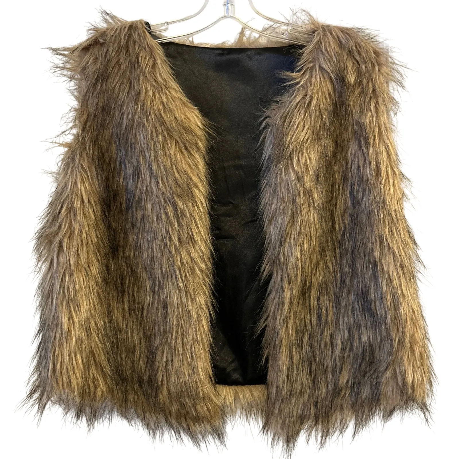 Women's shaggy faux fur vest in a brown and tan ombre hue. This luxurious sleeveless jacket offers a plush texture and a flattering silhouette. The vest is lined with a smooth black satin material for comfortable wear. Excellent condition. Measurements: • A. Armpit to Armpit: 20" • B. Length: 21" Type: Vest Outer Shell Material: Faux Fur Style: Basic Jacket Department: Women Lining Material: Polyester Theme: Animals Accents: Fur Trim Features: Lined, Open Pattern: Animal Print Insulation Material: Polyester Season: Fall, Winter Occasion: Casual, Party/Cocktail Sleeve Length: Sleeveless Keywords: faux fur vest, shaggy vest, ombre vest, brown vest, tan vest, sleeveless jacket, luxury vest, boho vest, winter fashion, fall fashion, cozy vest, statement vest Fast shipper- most item ship within 1 day!