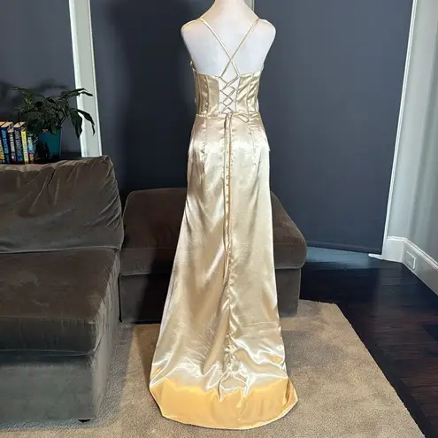 Women’s Full Length Dress with Criss Cross Corset Back Straps and a front Leg Slit This dress is really beautiful, the color is stunning. The front leg slit goes quite high (see pictures) Perfect for all formal occasions - Prom, Parties, Birthday, Work Event, Wedding Guest or Special Event! Size 8 - please see pictures for approximate lay flat measurements. As the top back is corset straps they are adjustable to fit your shape. The lower skirt section has a rear zipper. Small train (longer at the back than the front) *Please note my camera washes out the color on close up pictures. Color is more accurate in further away pictures of the dress on the dress form NEW in original packaging (manufacturer does not attach tags) *Please note, I have this dress in multiple sizes, the dress on the dress form is a smaller size, the lay flat size pictures are of the actual size 8 dress you are purchasing. *Color is subjective and may vary based on lighting and device used to view this item 1914B27