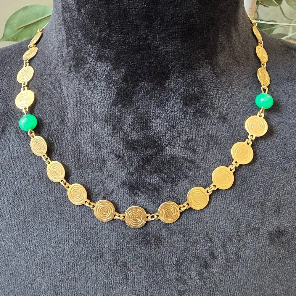 Color: Gold & Green Type: Necklace Department: Women's Occasion: Partywear, Anniversary, Birthday, Christening, Christmas, Engagement, Graduation, Mother's Day, Valentine's Day, Wedding Disclaimer: Please be aware that vintage/estate jewelry items may show signs of wear and age due to their historical nature. Any imperfections or variations in appearance should be considered part of their charm and uniqueness. It's recommended to carefully examine the item's condition and ask for detailed information before making a purchase decision.