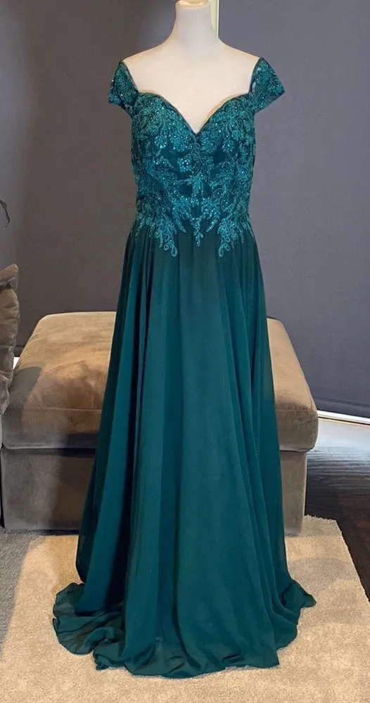 Women’s Full length Chiffon Dress - gorgeous deep green color. This dress bodice sparkles as you move! Perfect for Bridesmaid, Wedding Guest, Party, Special Event, Formal, Mother of the Bride, Mother of the Groom or Prom. Size 8 - please see pictures for approximate lay flat measurements. NWOT but has been tried on *Color may vary based on lighting and device used to view this item 0274B10