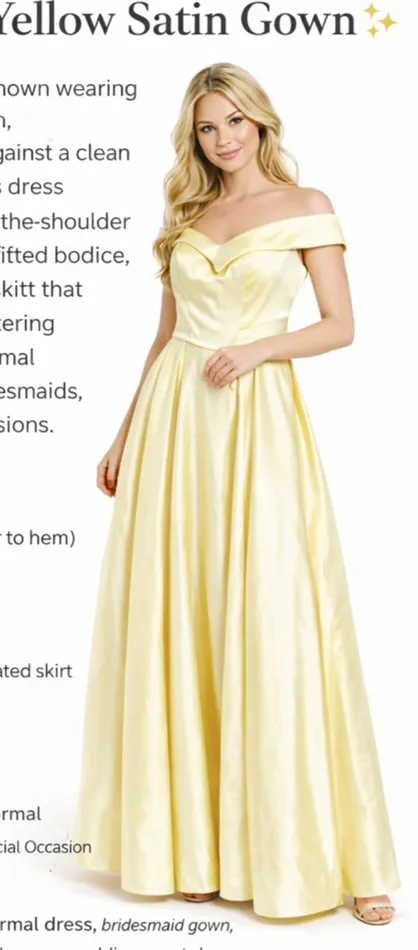 This pre-owned JJ's House gown is a soft yellow, off-the-shoulder satin dress with a pleated skirt. The dress features a structured bodice and a flowing, floor-length skirt. Measurements indicate a length of 58 inches from shoulder to hem. The care tag specifies 100% polyester, "DO NOT WASH," "DO NOT DRY CLEAN," and "PROFESSIONAL SPOT CLEAN ONLY." The garment appears to be in excellent condition with no visible imperfections. 30’ pit to pit 58’ length
