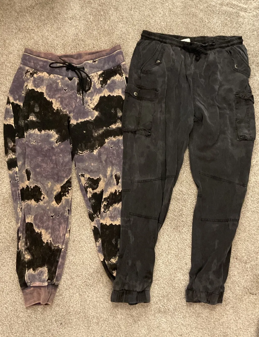 Women's Joggers Bundle: Joy Lab Sweatpant Joggers & Vintage Havana Joggers Size:M Both in excellent used condition! No stains or flaws 1. Joy Lab Acid Wash Tie-Dye Joggers Baggy fit Drawstring waist Made in China 98% Cotton, 2% Spandex Measurements: Waist across-15" Rise-12.25" Length-34.5" Inseam-23.75" Ankle-3.75" 2. Vintage Havana Color Block Black/Gray Cargo Joggers Made in China 100% Tencel Cargo pockets on sides and back Measurements: Waist across-15" Rise-11.25" Length-36.25" Inseam-26.5" Ankle-5.5"