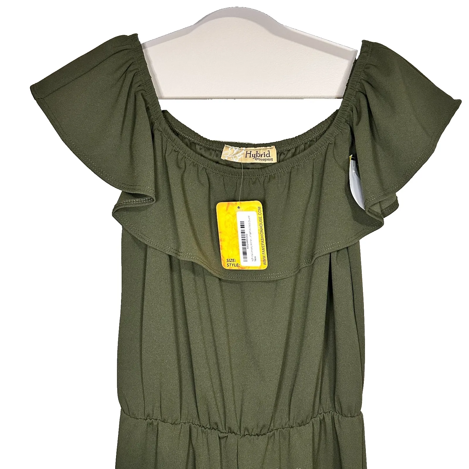 This women's jumpsuit in olive green, size medium, is a stylish and versatile addition to any wardrobe. The sleeveless design and wide-leg silhouette offer comfort and ease of movement, while the solid color and one-piece construction make it a chic and classic choice. Made of polyester, this jumpsuit from Hybrid & Co is perfect for a variety of occasions, from casual outings to more dressed-up events. The 28-inch inseam ensures a flattering fit, and the on-trend style makes it a must-have piece for any fashion-forward woman.
