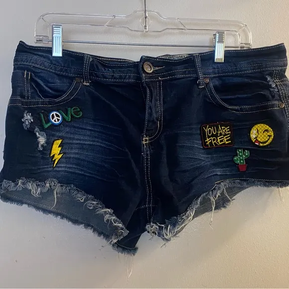 Stylish denim shorts featuring playful patches. Perfect for a casual day out. Excellent condition with no stains or damages distressed cut off edges and embroidered patches allover