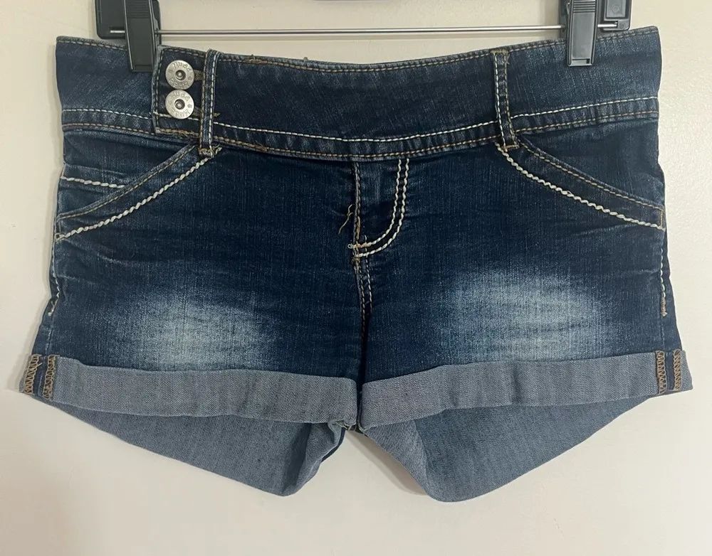 Women’s Juniors Mudd 90s Y2K Denim Jean Shorts Dark Wash Contrast Trim Size 9 Waist measures 16” lay... Show more
