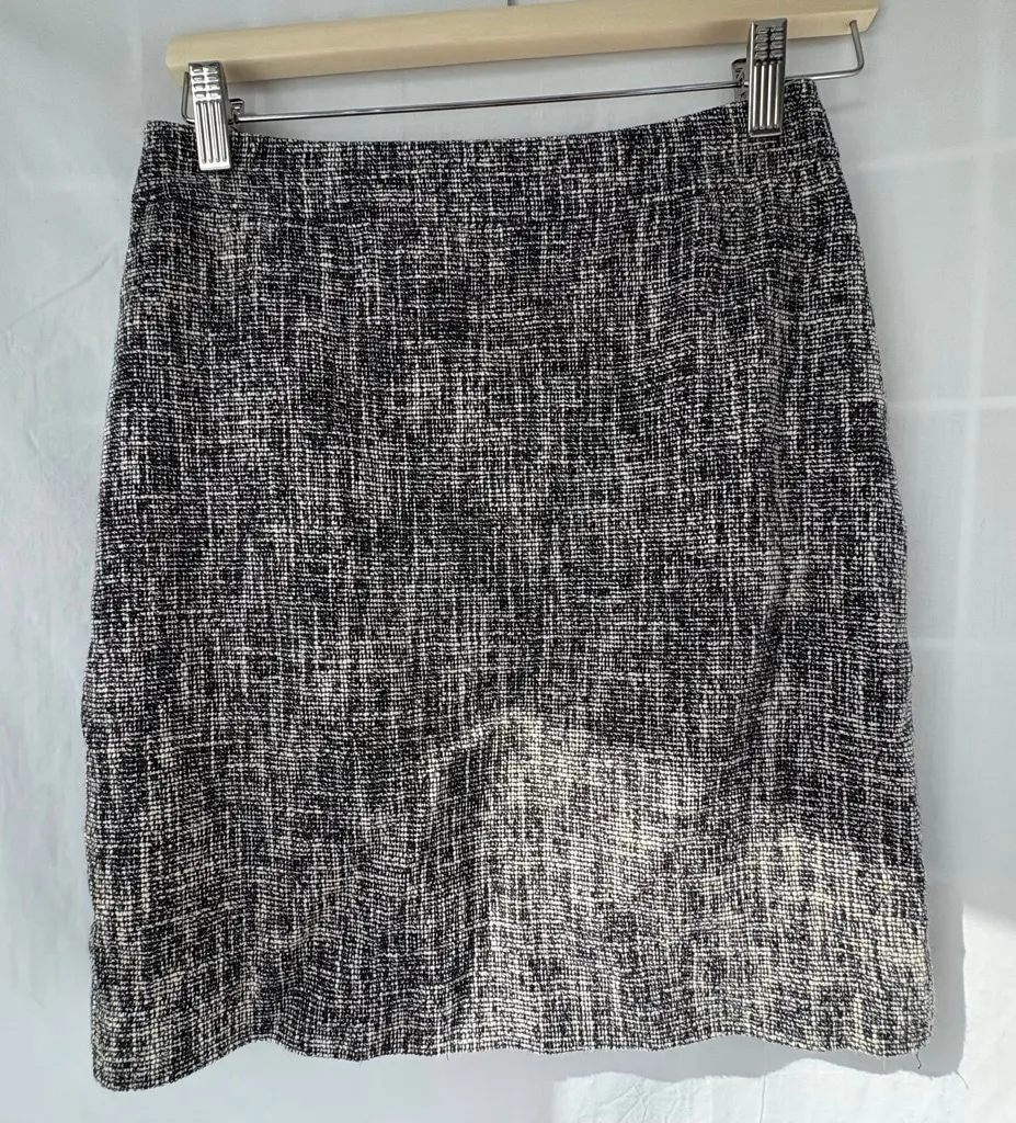 pencil skirt in size 0, featuring a black and white tweed pattern. The... Show more