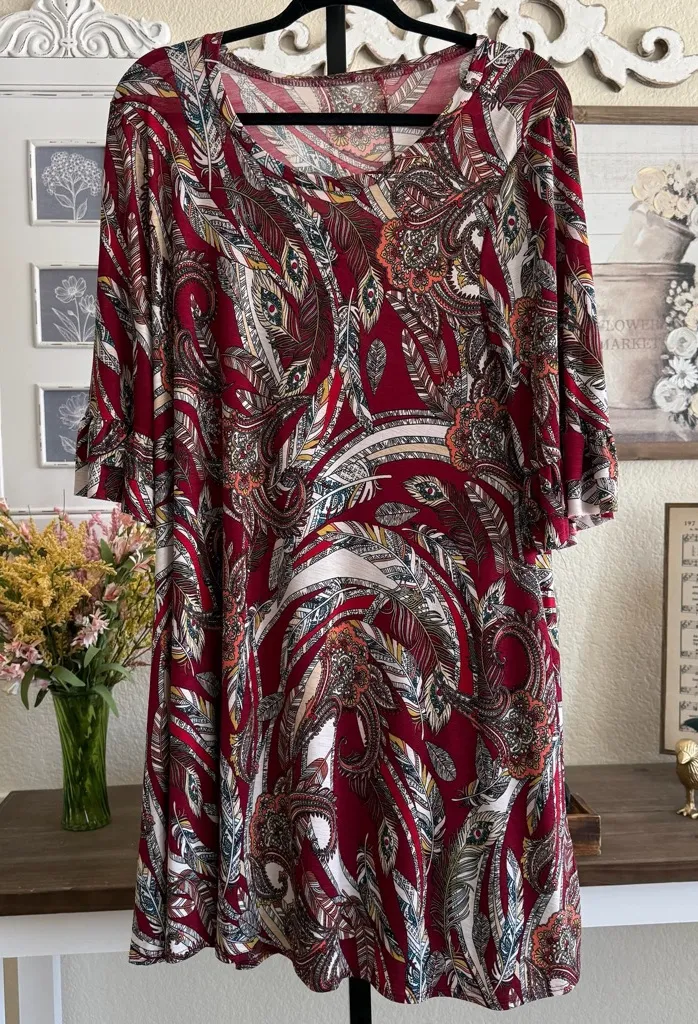 Boho Red Paisley Print Swing Dress Women’s L XL Flowy Casual Everyday Tunic Outfit Approx. Measurem... Show more