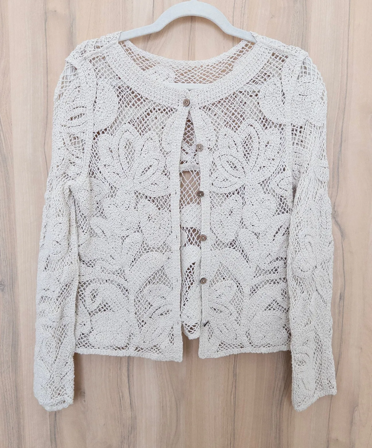 A beautiful cream crochet open-front cardigan sweater. This unique piece showcases intricate floral and leaf lace detailing throughout, creating a delicate and airy feel. It features a classic crew neckline, long sleeves, and a row of small, round button closures down the center front. The open-knit construction makes it perfect for layering. Ideal for a beach vacation, a casual brunch, or adding a touch of bohemian flair to any outfit. *Check last photo for approx. measurements, taken flat lay* Style: boho, cottagecore, romantic, victorian, lacecore, shabby chic, coquette, festival, vintage-inspired, feminine, ethereal Condition: Excellent condition. No visible flaws. See all photos for details. Fit: Missing size and brand tag. Based on the measurements: Pit to Pit: 17.75" Length: 20.5" š” Estimated Size: Women's Small Ships next business day. Bundle deals available. Smoke-free home. Please check measurements before purchasing.