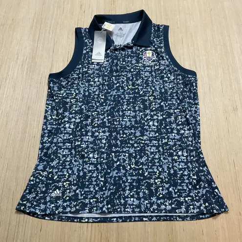 This product is a women's large Adidas sleeveless polo shirt in a blue color with a multicolor speck... Show more