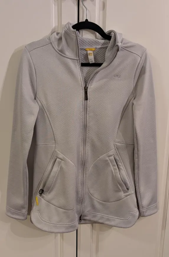 This is a pre-owned women's Lolë full-zip hoodie in a light gray color, size XS. It features a textu... Show more