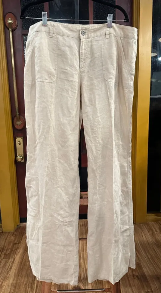 These are a pair of women's London Jean wide-leg pants in a beige linen fabric, size 14. The pants f... Show more
