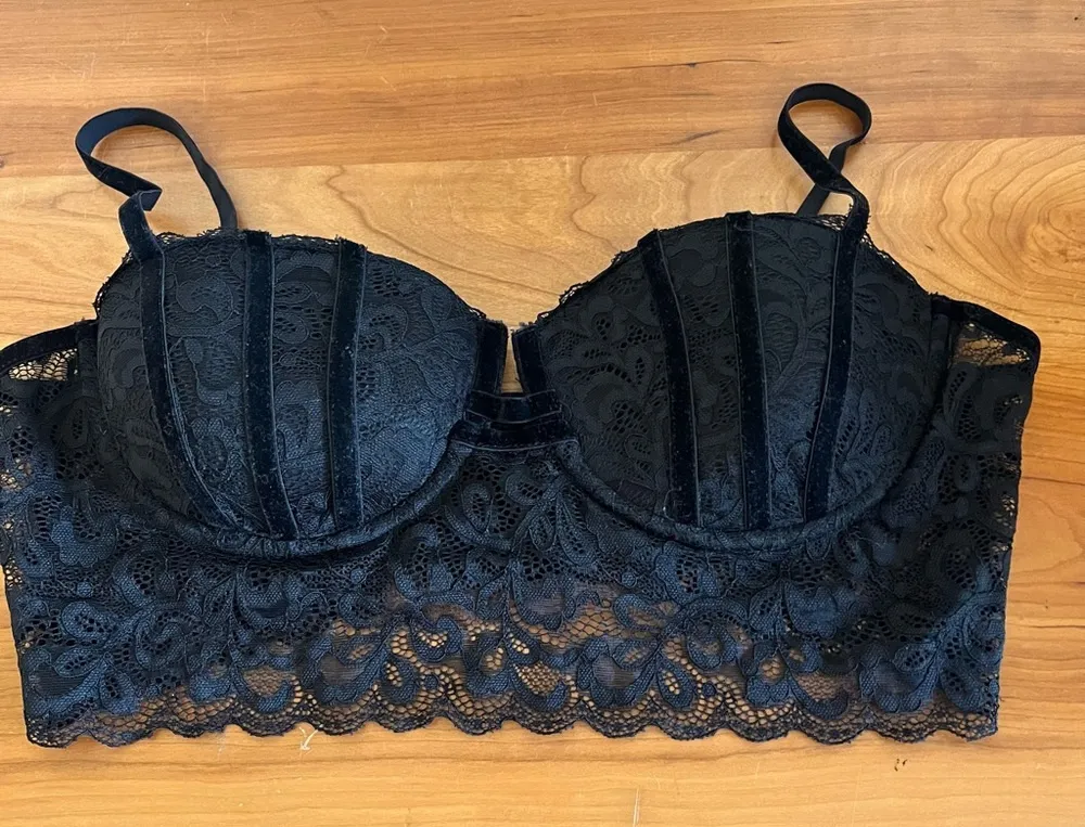 Women’s Lulus Black Lace Padded Long Line Bra Velvet Details Size XL Excellent pre owned condition N... Show more