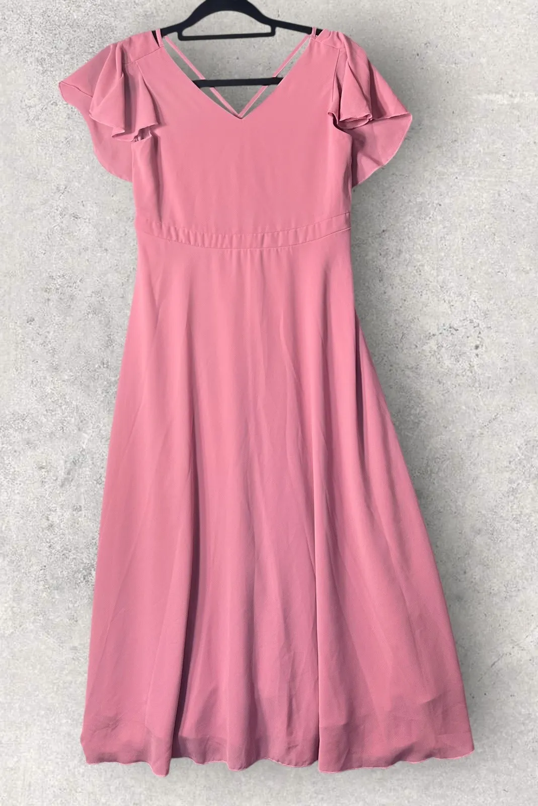 Features: Style: A-Line, Maxi Lined: Dress is lined Occasion: Formal, Wedding, Party/Cocktail Material: Polyester, chiffon fabric type Neckline: V-Neck Sleeve Type: Flutter Sleeve Size: S waist 14.5 (flat lay) Length: 47" **No size tag. Measures to be approximately a small, however, please check measurements in pics for your more exact sizing. Color: Pink Condition: Pre-Owned **Fast Shipping / Smoke Free Home** Keywords: maxi dress, pink dress, formal dress, wedding guest dress, ruffle sleeve dress, v neck dress, evening dress, party dress, special occasion dress, long dress, aline dress, bridesmaid dress, summer dress, spring dress