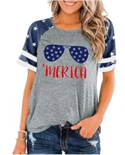 Womens ‘Merica Sunglasses Shirt. Short Sleeves Size Large EUC 20” Across Chest 27” Length Machine Washable 80% Cotton 20% Polyester America/ Red White And Blue 4th of July and Independence Day Shirt!