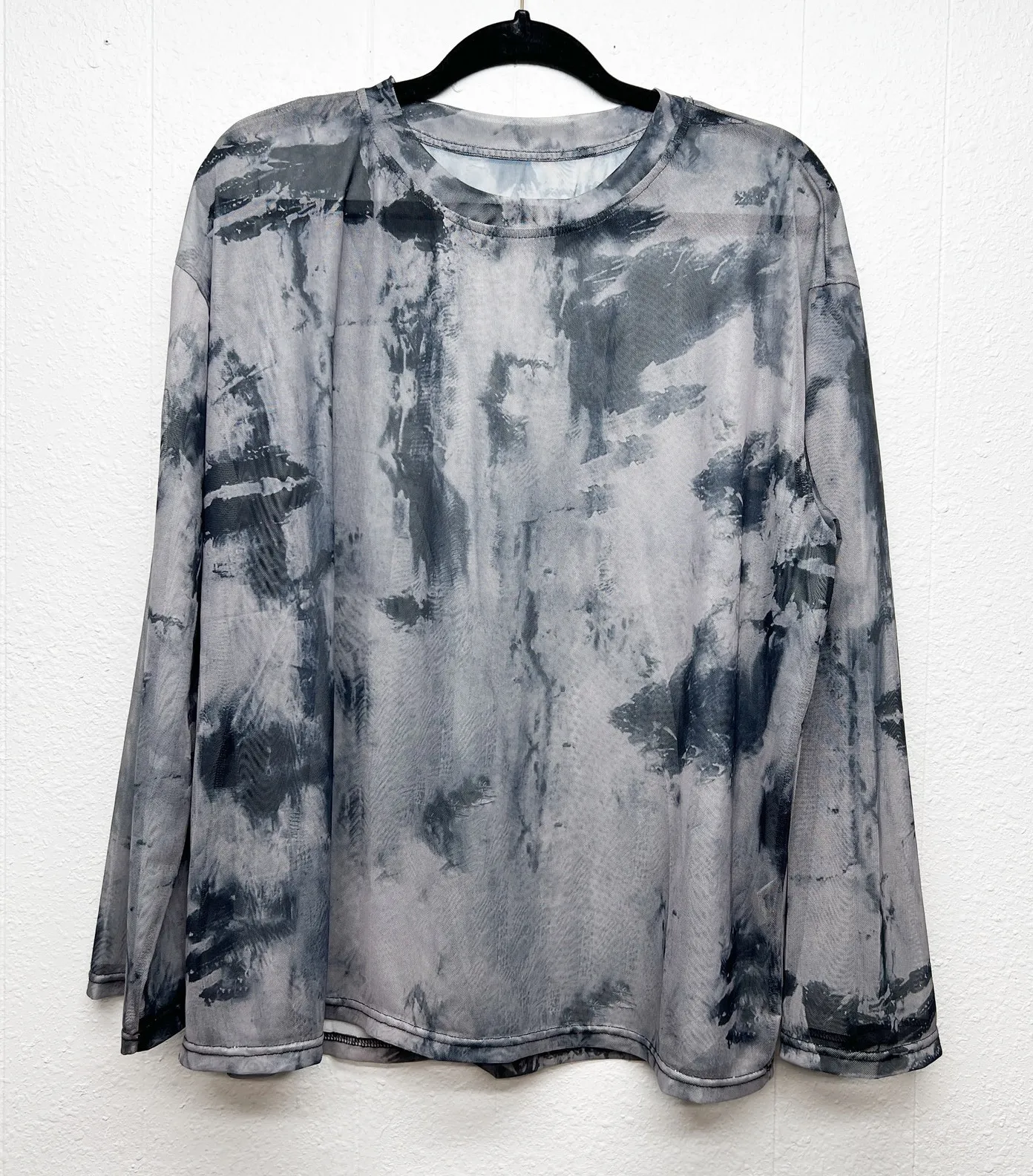 Womens mesh tie dye top in gray & black. Crew neck. Long wide sleeves. Lightweight & stretch. In good used condition. No stains, tears or holes. No material tag. Polyester feel. No size tag, but according to measurements should fit a size XL. Length: 26"