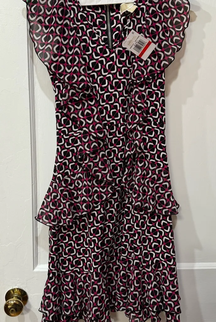 Elegant dress with bold geometric design. Features a zip closure and stylish ruffled details. NWT -... Show more