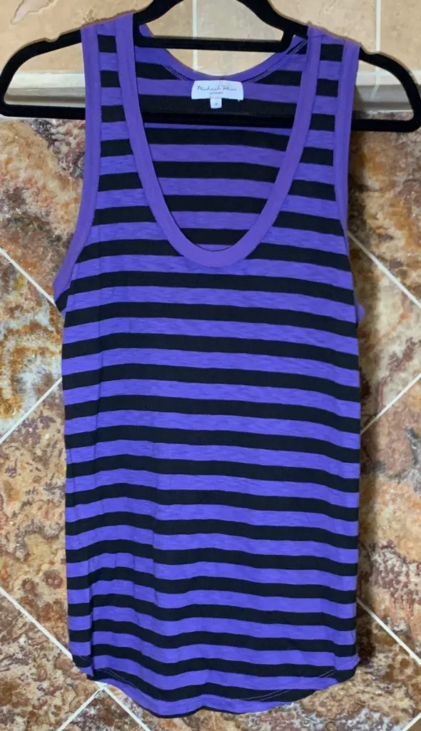 The Michael Stars Tobi Striped Tank, is a must-have addition to your wardrobe. Made by the renowned brand Michael Stars, known for their contemporary essentials for everyday wear, this tank is perfect for any occasion. The Tobi Striped Tank features a stylish design in a galaxy purple and black stripes, adding a touch of whimsy to your outfit. With a comfortable scoop neck, this tank offers a flattering silhouette. Measuring approximately 24.5 inches from shoulder to hem, this tank is designed to fit just right. Crafted from a high-quality blend of 50% Supima cotton and 50% rayon jersey, this tank offers softness and durability. It is also machine washable for easy care. Perfect for layering or wearing on its own, the Michael Stars Tobi Striped Tank is a versatile piece that can be dressed up or down according to your style. Don't miss out on this trendy tank; it is proudly made in the USA. Add it to your cart now and elevate your wardrobe with this essential piece. Perfect for the fall / winter season and especially Halloween / October.