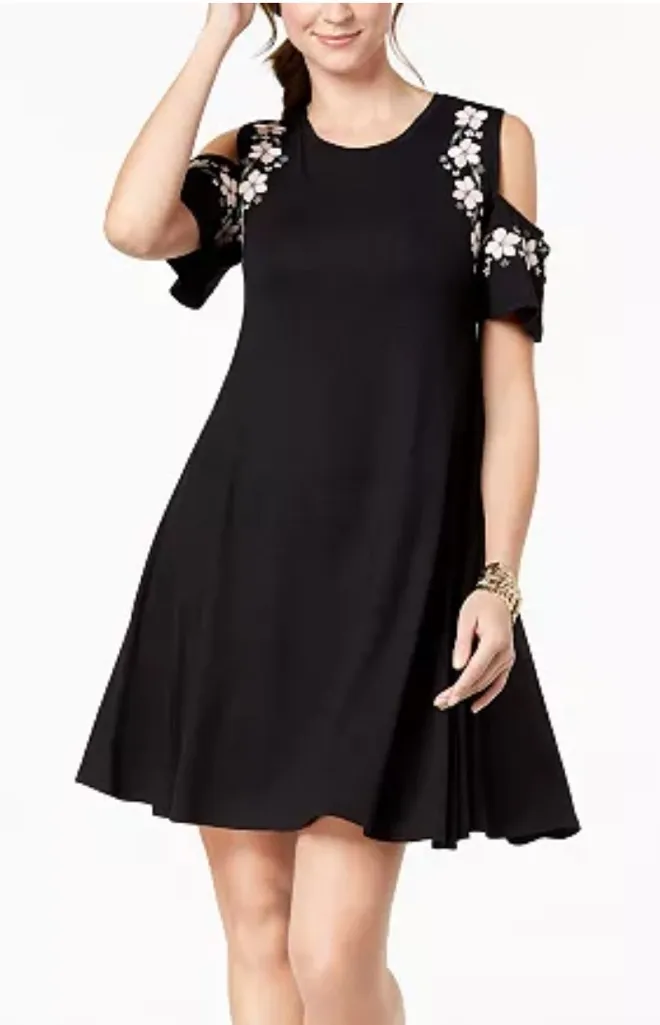 Style & Co Dress Womens Medium Black Embroidered Floral Swing Knee Cold Shoulder Pullover Brand Sty... Show more