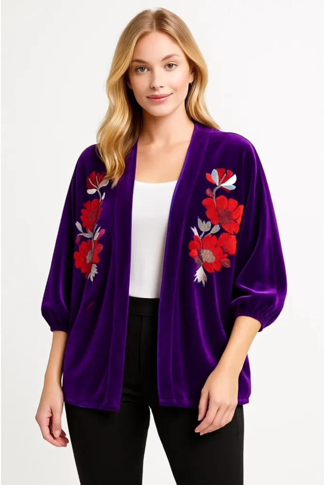 This NATORI women's open-front cardigan is made from deep purple velvet (91% Polyester, 9% Spandex). It features red, white, and light green floral embroidery on the front panels and 3/4 length sleeves with gathered cuffs. The garment is size XS/S, made in the Philippines. It measures approximately 26-27 inches in length. A flat measurement across the garment shows approximately 52-53 inches. The item appears new with no visible imperfections. P550 201