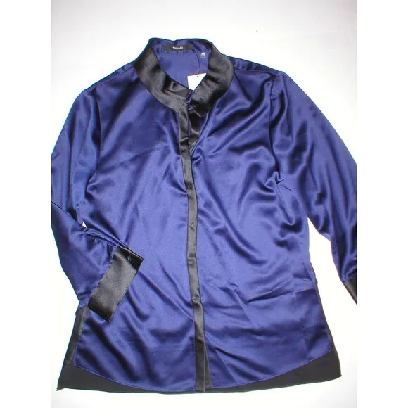 Tahari Beautiful! This is a polyester blend blouse done right! It will be wrinkled when you get it. Very pretty top. I have the same top! Everytime I wear it I get compliments! I love the dark richness of this blue! Mock turtleneck and contrasting black. The front snaps closed, no buttons! Very cool top! This top is so soft! Great for work or everyday life. Pair it with jeans, pants, dress shorts, jean shorts, or a skirt! LOVE this!! MSRP on tag $138