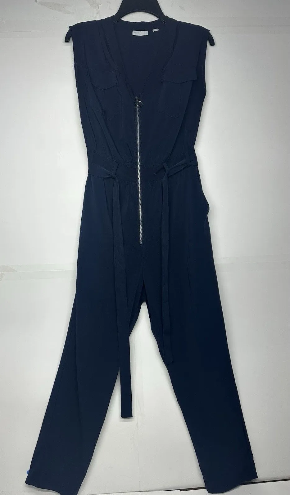 Elevate your fashion game with this stylish NY&CO Navy Blue Jumpsuit in size medium. This one-piece wonder is perfect for any occasion, whether you're traveling, going to a party, or just lounging around. It features a V-neckline, cap sleeves, and an elastic waistband with a belt to accentuate your silhouette. The jumpsuit is made of a blended fabric of polyester and spandex, making it stretchy and comfortable to wear during the summer and spring seasons. The jumpsuit has a solid pattern and comes in a beautiful shade of blue, making it a classic addition to your wardrobe. It has pockets, straps, and a zipper for added convenience. This jumpsuit is perfect for those who love a relaxed fit and want to look chic and trendy. Get your hands on this New York & Company jumpsuit today! Navy blue it does have some light piling on it the pit to pit is 20 inches the shoulder length down 54 inches the end 27.5 inches