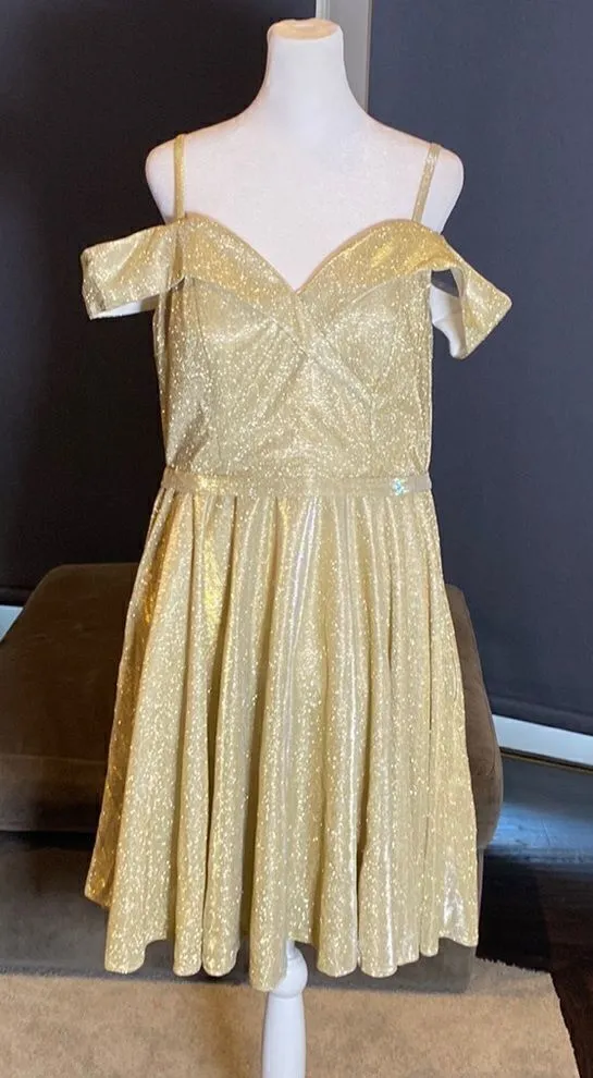 Women’s Off the Shoulder Short Gold Dress great for Parties, Prom or Special Events Size 12 - see pictures for approximate lay flat measurements. The length is approximately 37”from shoulder to hem. The material is stretchy so there is room to go a little larger. The back is corset style so there is also room for adjustment here too which is nice. The dress sparkles as you move, a really pretty dress! There are also hidden pockets on either side which is a huge bonus. NWOT but has been tried on *Color may vary based on lighting and device used to view this item 0013B83